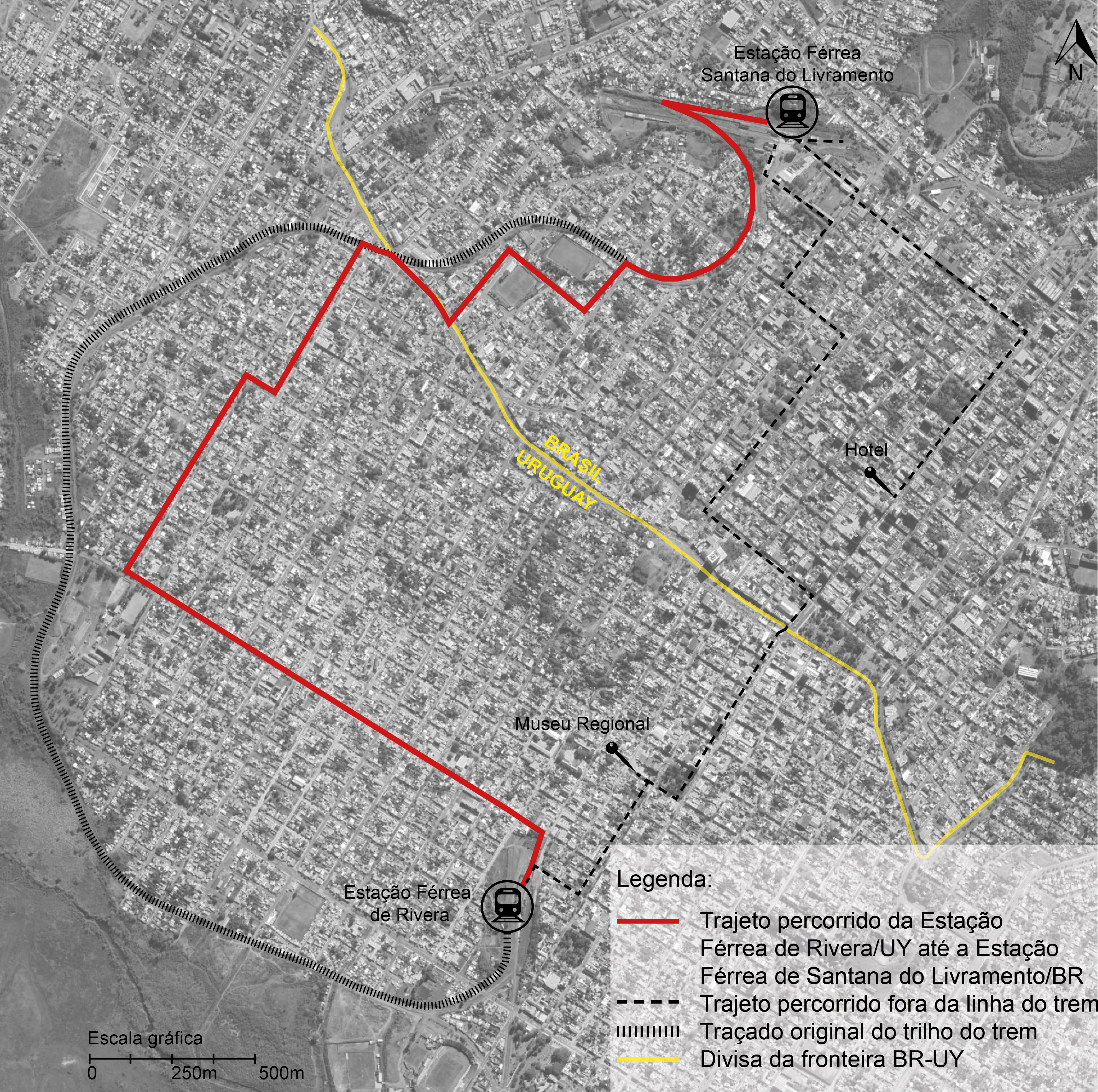 No contexto da fronteira entre Brasil e Uruguai, a ponte e as bordas do rio Jaguarão são pontos marcantes na paisagem, pois trazem a questão com o estrangeiro no território de fronteira. No lado brasileiro, pode ser percebido o acampamento cigano próximo à ponte que conecta o outro lado da fronteira. Como apontado por Fuão (2014), a ponte pode servir como ponto de acolhimento para aquele que vem de fora. No lado uruguaio, podem ser identificadas as free shops, lojas que recebem o turista (estrangeiro) que vai comprar mercadorias – uma atividade marcante no contexto fronteiriço (Musso 2004). Em Jaguarão, na parte superior da imagem, os trilhos podem ser entendidos como algo “ultrapassado” e, por isso, contrários ao movimento de evolução da cidade, tendo sido reconvertido, assim, num canteiro central com palmeiras em seu lugar. Mais adiante, o traçado regular da malha urbana é dissolvido pelos moradores que invadiram a linha desativada do trem. Estes novos usos se sobrepõem à história e revelam as novas dinâmicas nesses territórios. No entanto, por onde a expansão urbana não se alastrou, o complexo ferroviário segue em um estado de aguardo, sendo estes os lugares do possível, com outro ritmo, mais lento, silencioso e pausado. A natureza é quem toma conta da paisagem, trazendo um sentimento de introspecção e contemplação. Os trilhos ferroviários compõem esse cenário, mas estão adormecidos. Mais adiante, eles dividem a cidade em duas partes, mas também são elos entre as localidades. Os moradores os utilizam como ponto de passagem, conexão e atalho, uma fuga dos caminhos de ordenamento urbano reticulados.